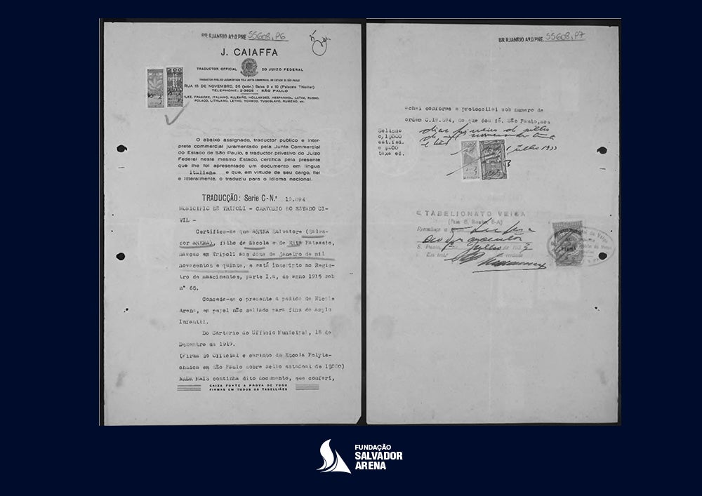 - Tradução juramentada da certidão de nascimento de Salvador Arena, anexada ao seu processo de naturalização: