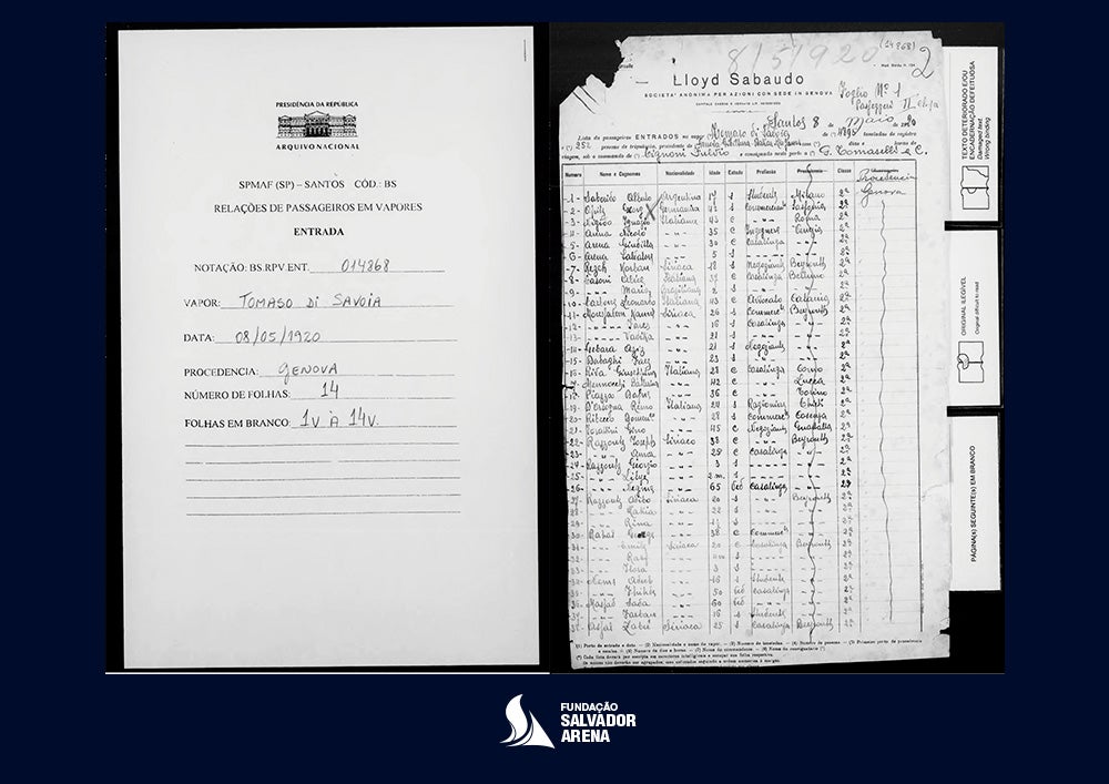 - Lista de passageiros do navio em que Salvador Arena chegou ao Brasil com sua família, em 1920 (os nomes da família Arena constam nas posições 4, 5 e 6 da lista):