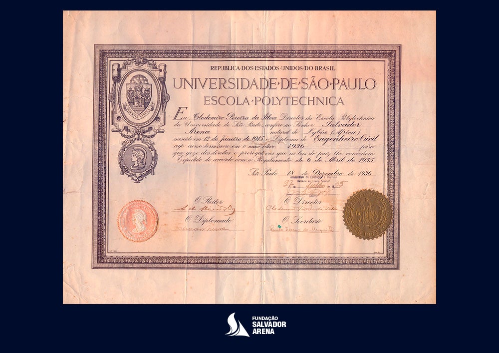 - Diploma de Engenheiro Civil concedido a Salvador Arena pela Escola Politécnica da Universidade de São Paulo em 18 de dezembro de 1936: