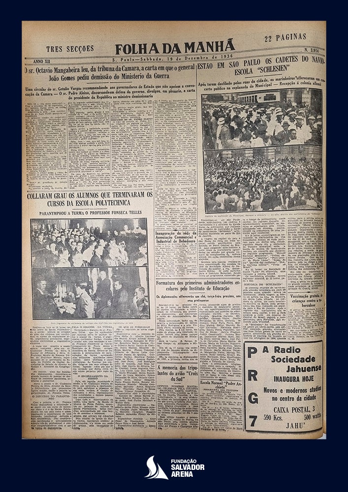 - Matéria publicada no jornal Folha da Manhã, em 19 de dezembro de 1936, sobre colação de grau de formandos dos cursos da Escola Politécnica da Universidade de São Paulo: