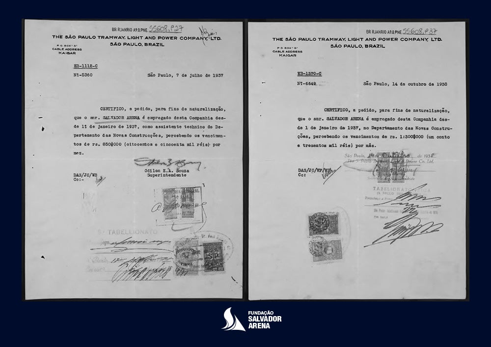 - Certificados de emprego fornecidos pela Light e anexados por Salvador Arena ao seu processo de naturalização: