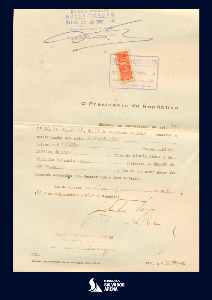 - Documento concedendo nacionalidade brasileira a Salvador Arena, datado de janeiro de 1954: