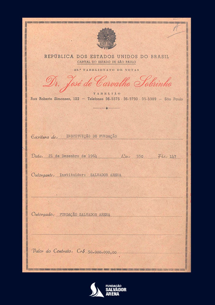 • Engenheiro Salvador Arena institui a Fundação como herdeira universal de todo o seu patrimônio.