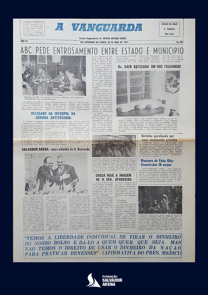 - Artigo do jornal "A Vanguarda", noticiando a entrega do título de "Cidadão Sambernardense" a Salvador Arena, disponibilizado pelo Centro de Memória de São Bernardo do Campo: