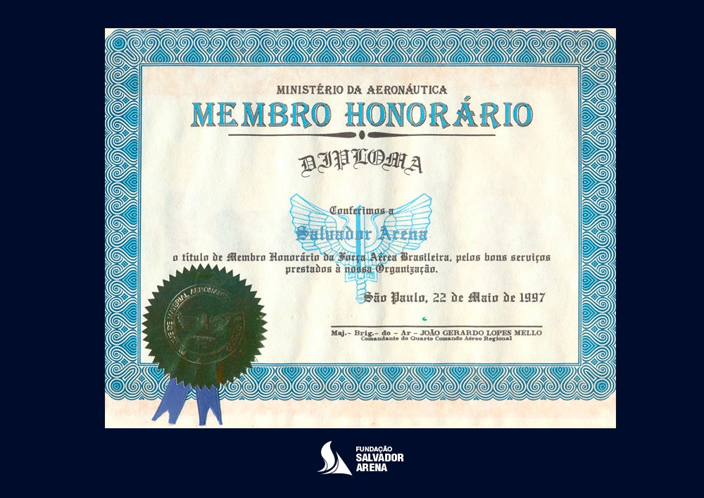 - Diploma de Membro Honorário da Força Aérea Brasileira conferido a Salvador Arena pelos bons serviços prestados ao Ministério da Aeronáutica: