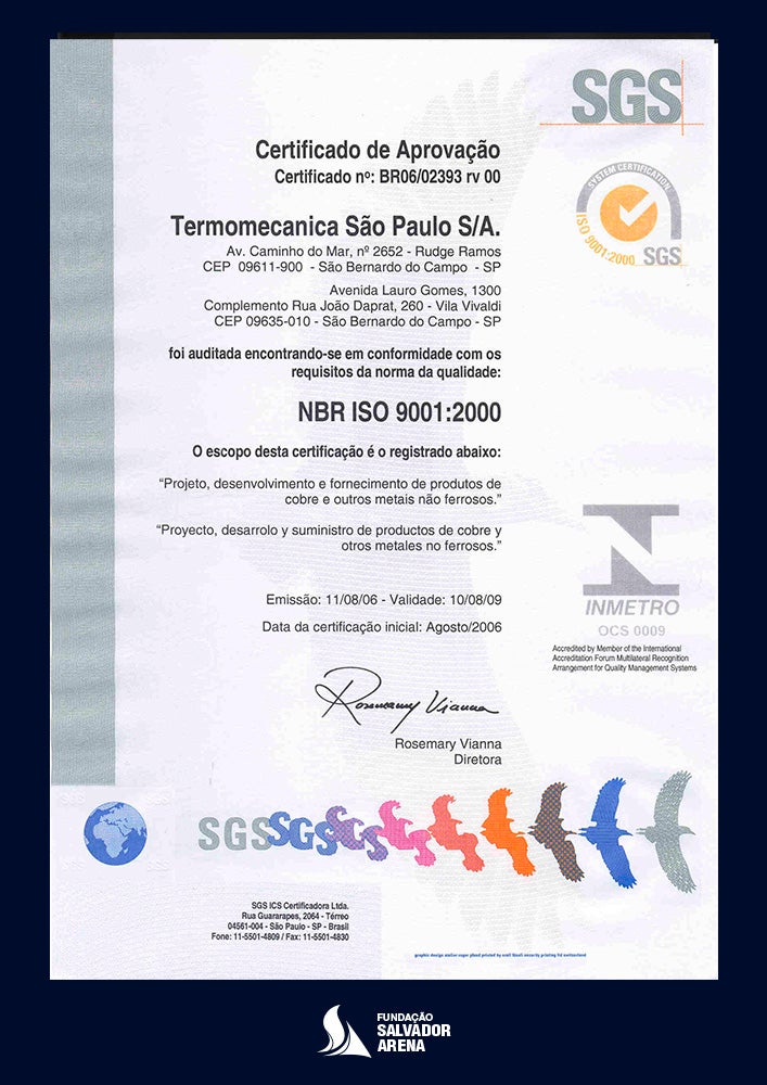 - Certificado ISO 9001 conferido à Termomecanica pela SGS em 2006: